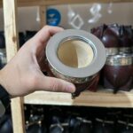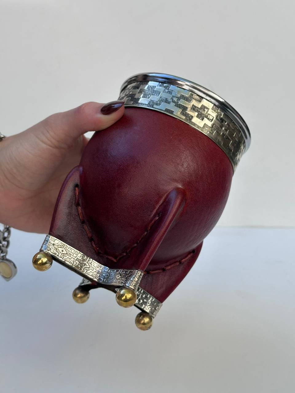 El mate es de cuero, con interior calabaza.