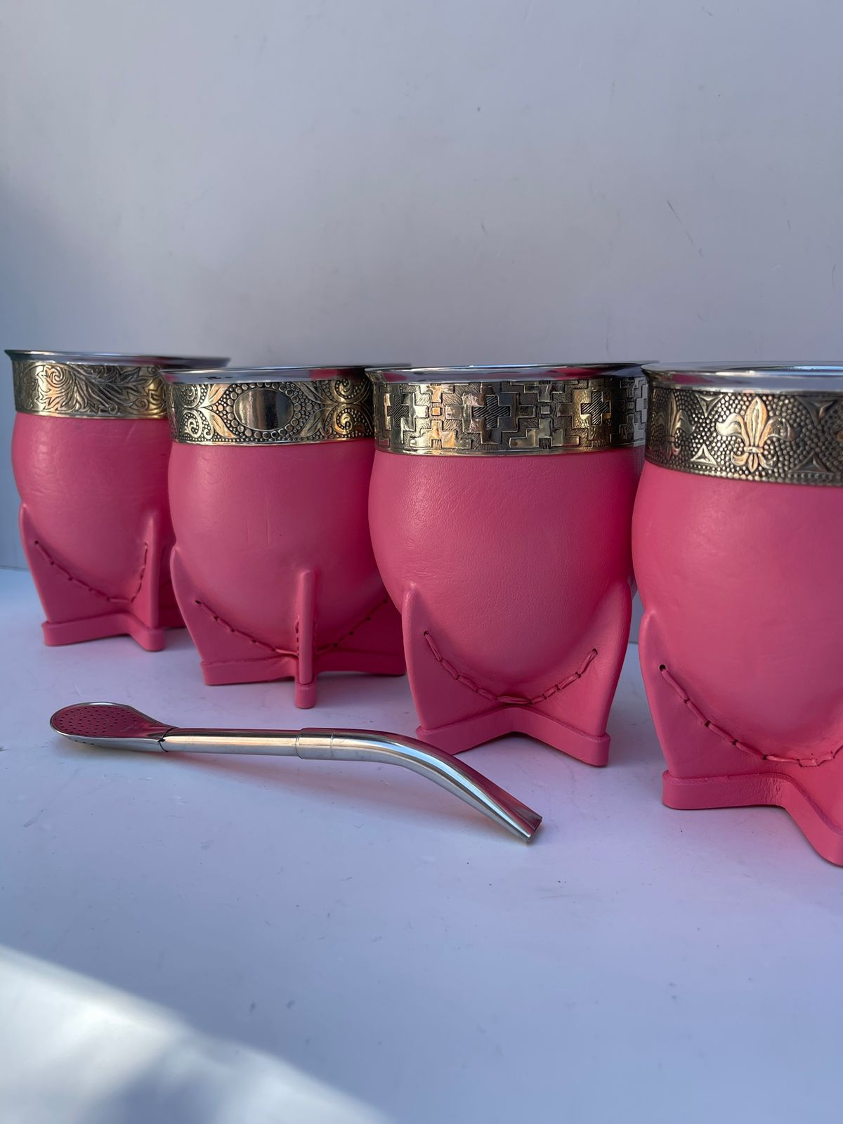 Imperial de cuero color rosa con guarda de alpaca con bombilla de acero inoxidable pico loro con filtro/ pala