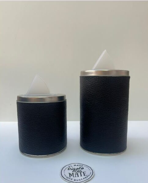 Yerbero y azucarero en latas forradas en simil cuero y acero grueso.