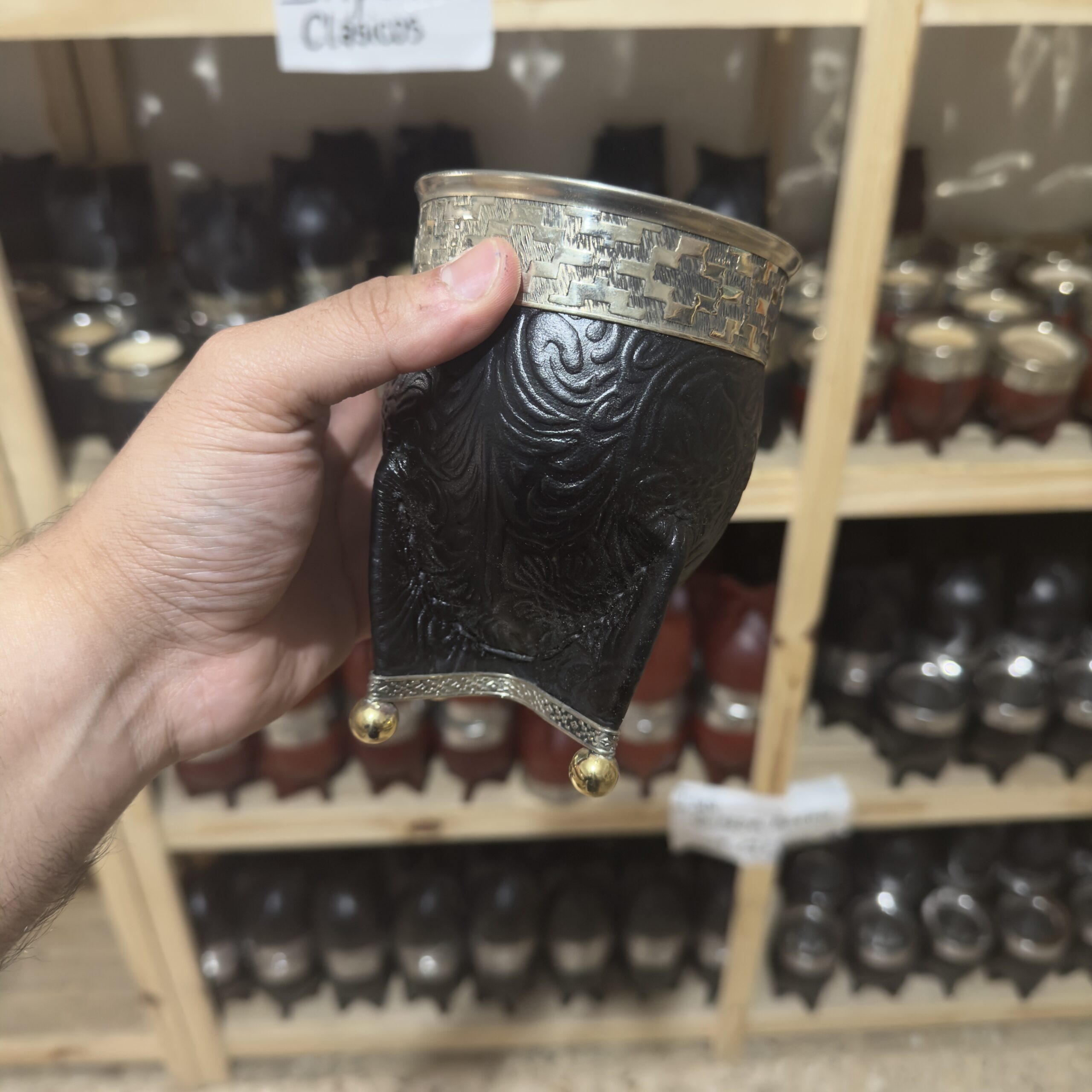 mate imperial BASE DE ALPACA Y PELOTAS – guarda de alpaca – cuero negro repujado + bombilla de acero