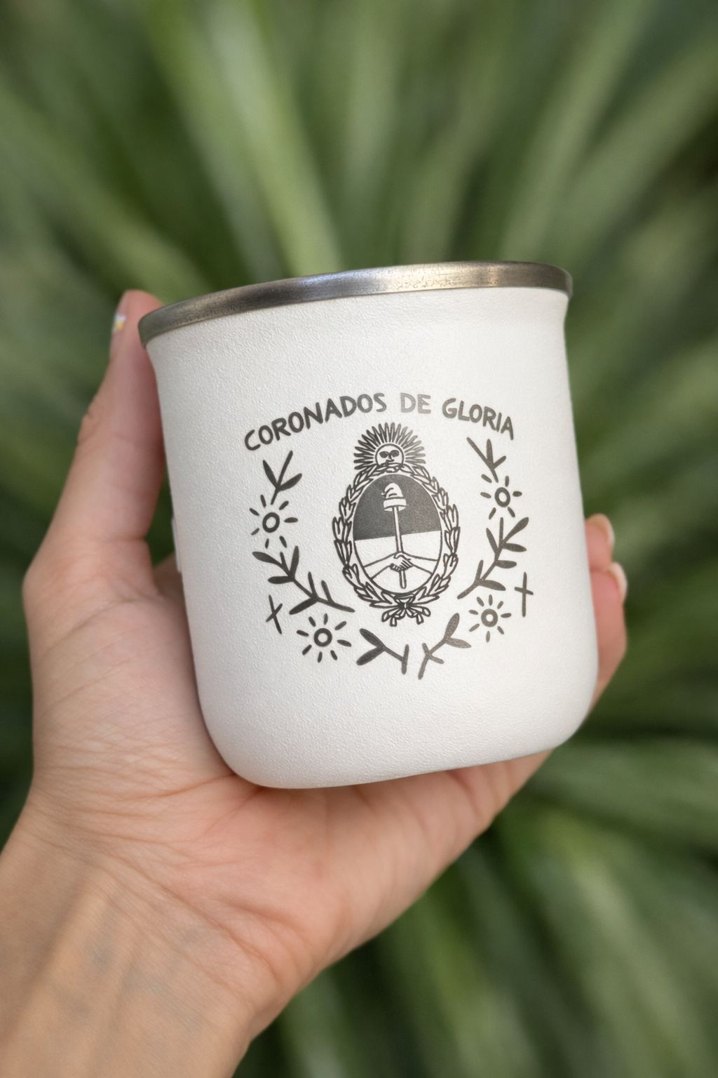 vasito termico blanco con grabado coronados de gloria